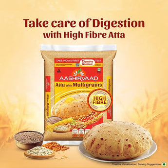 Aashirvaad Atta with Multigrains is high in fibre & helps digestion. 3 rotis fulfill 35% of your daily fibre requirement. The rotis taste just like your regular atta. It's a blend of 6 grains – wheat, maize, soya, channa, oats, psyllium husk. Make tasty rotis & never miss your daily dose of fibre.